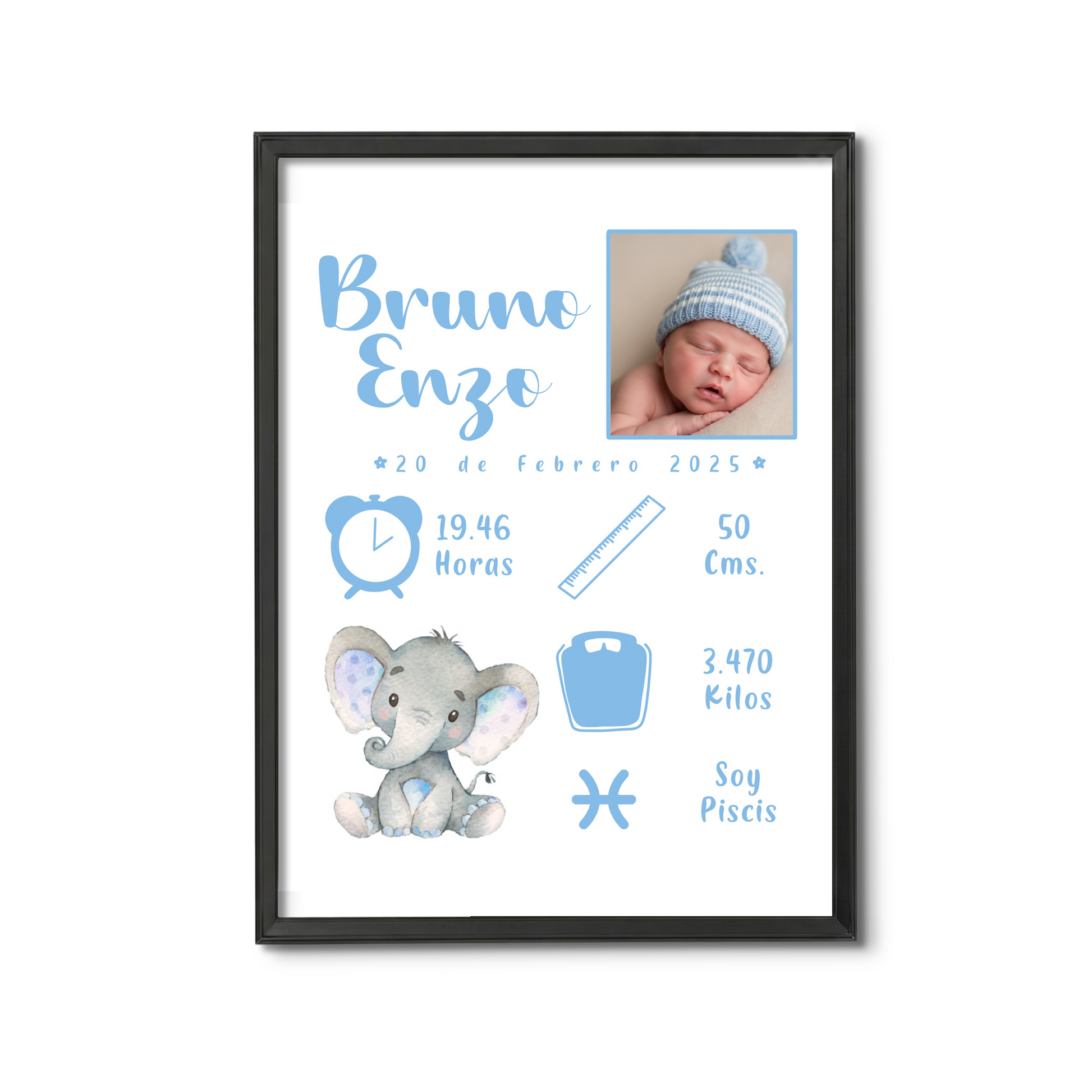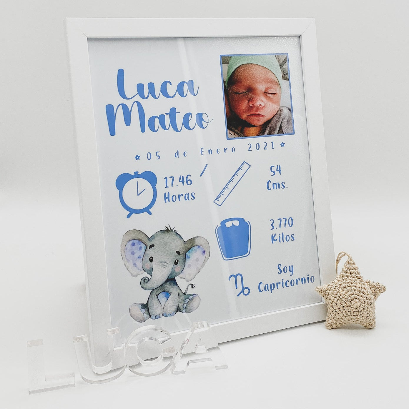 Celebra la llegada de tu bebé con un cuadro que reúne todos sus datos de nacimiento. Incluye su nombre, foto, fecha, hora, peso, tamaño y signo zodiacal. Es perfecto para decorar la pieza o regalar a la familia. Cada cuadro es personalizado, incluye impresión, marco y viene envuelto listo para regalar.