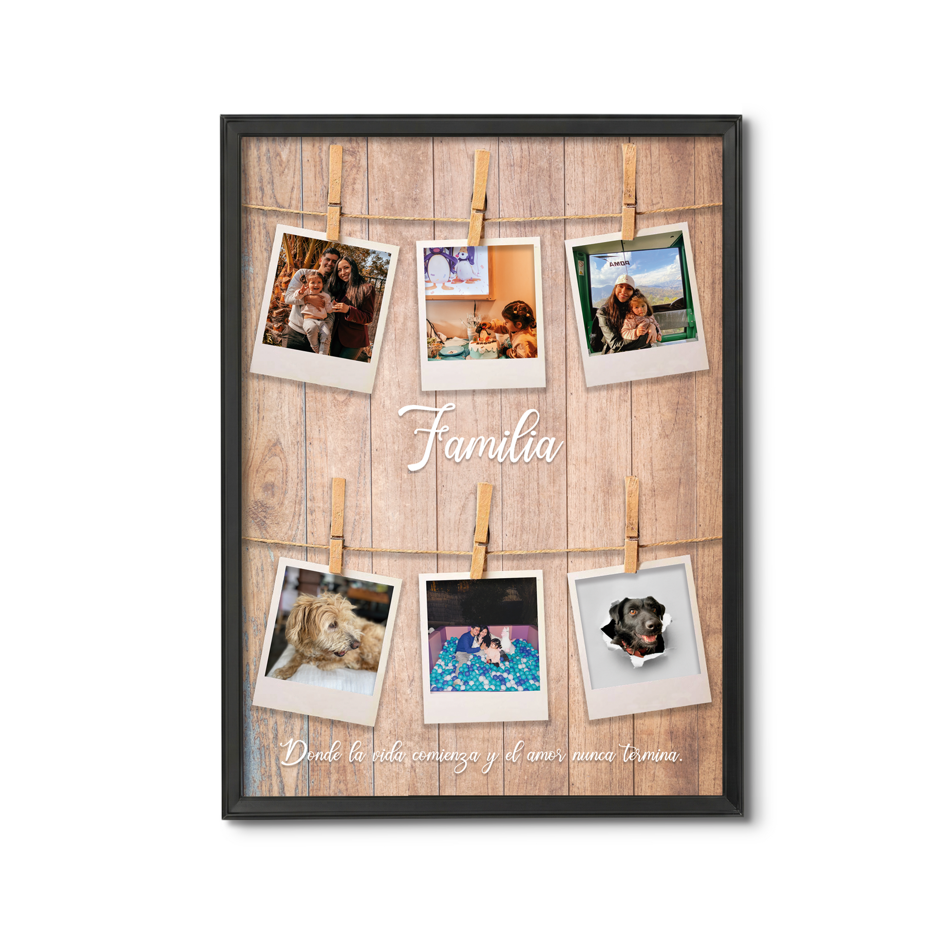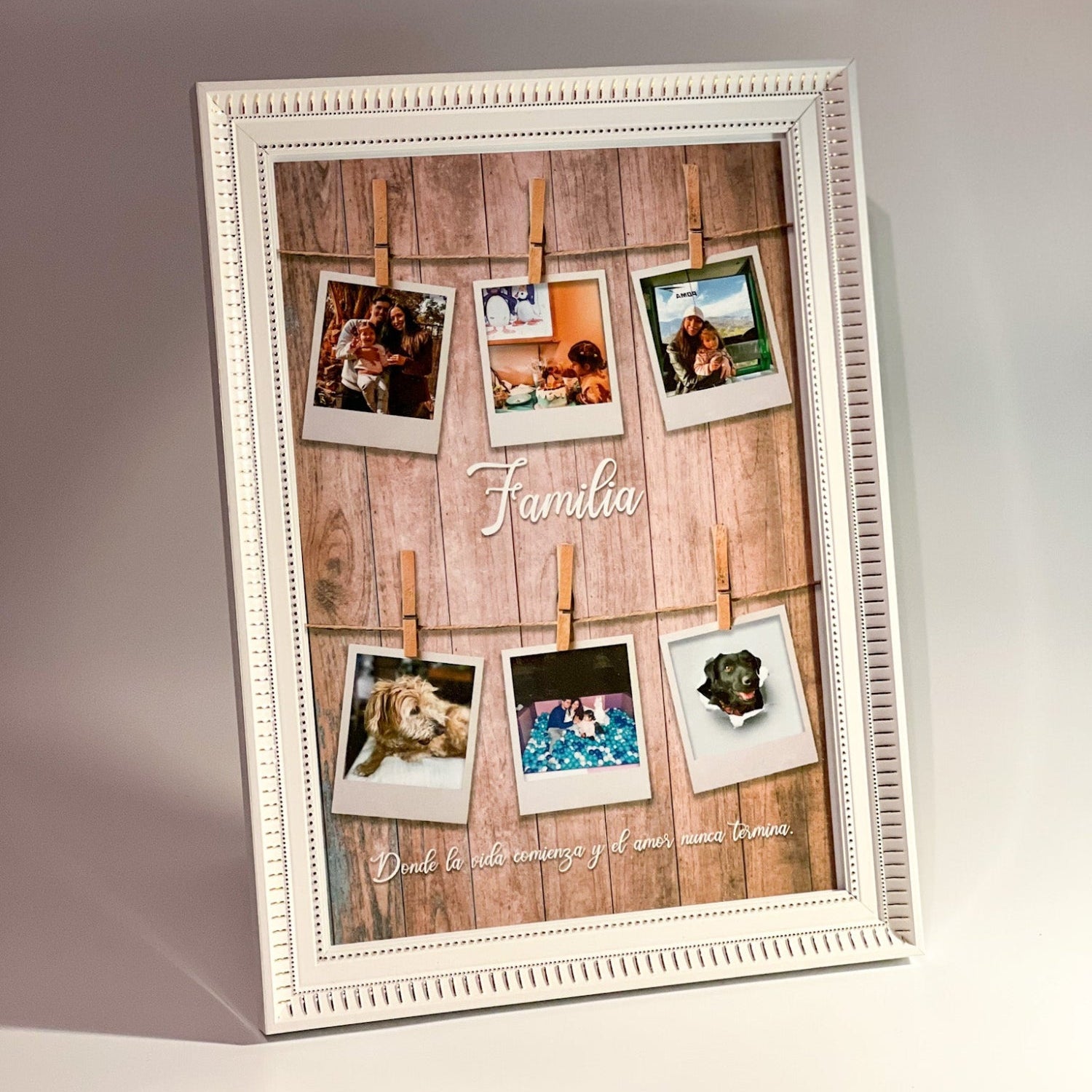 Tus mejores momentos en un cuadro. Seis fotos tipo polaroid, sobre fondo madera, con la palabra Familia. Cada cuadro es personalizado, incluye impresión, marco y viene envuelto listo para regalar.