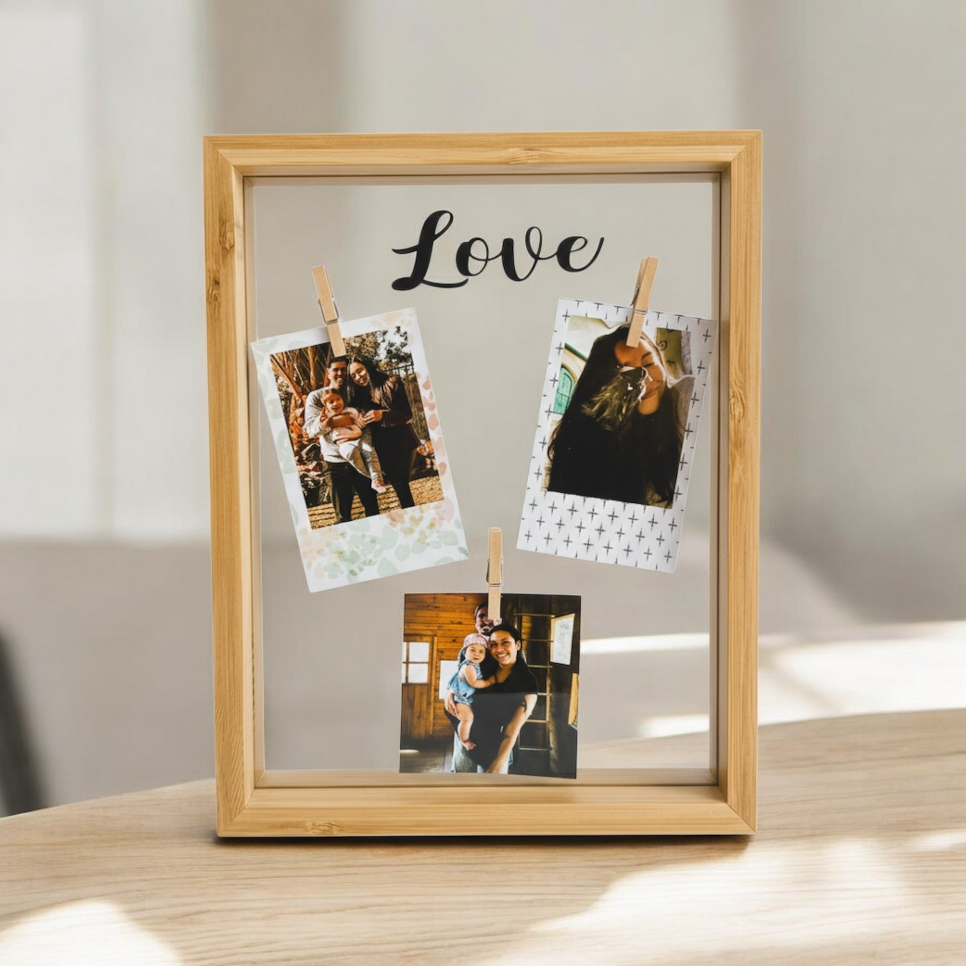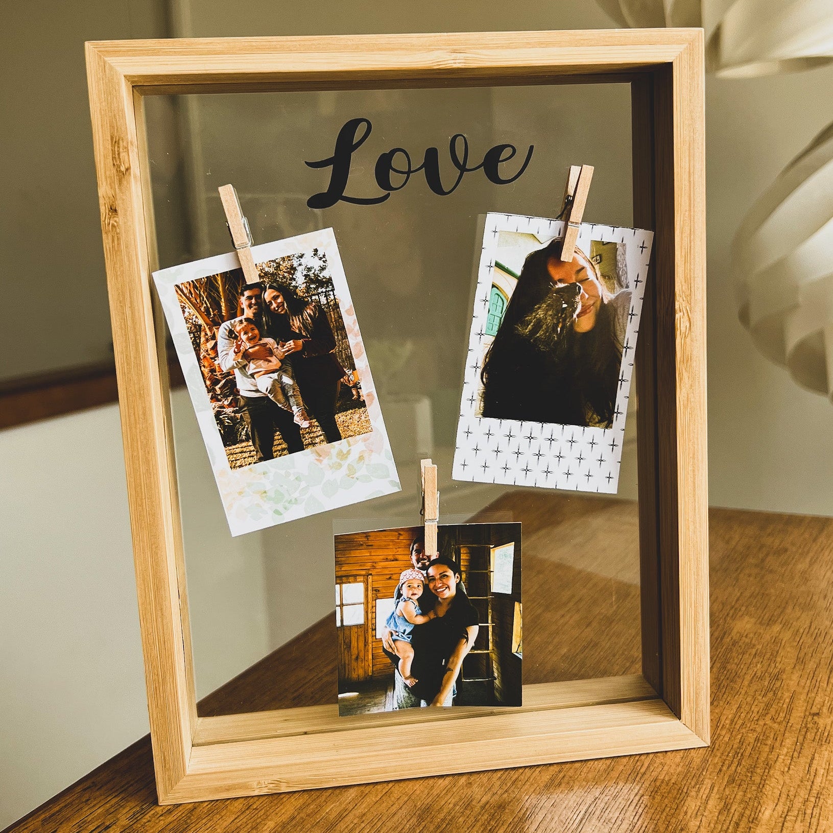 Nuestro Cuadro Flotante Love es una pieza especial que combina elegancia y creatividad. Con un diseño flotante de alta calidad (dos vidrios que crean un efecto moderno y minimalista), este cuadro incluye 3 perritos colgantes en el frente donde puedes colgar 3 fotos pequeñas. Además, en la parte superior lleva la palabra "LOVE" troquelada en negro, dándole un toque romántico. Medida: 21x26cm en doble vidrio. Cada cuadro es personalizado, incluye impresión, marco y viene envuelto listo para regalar.