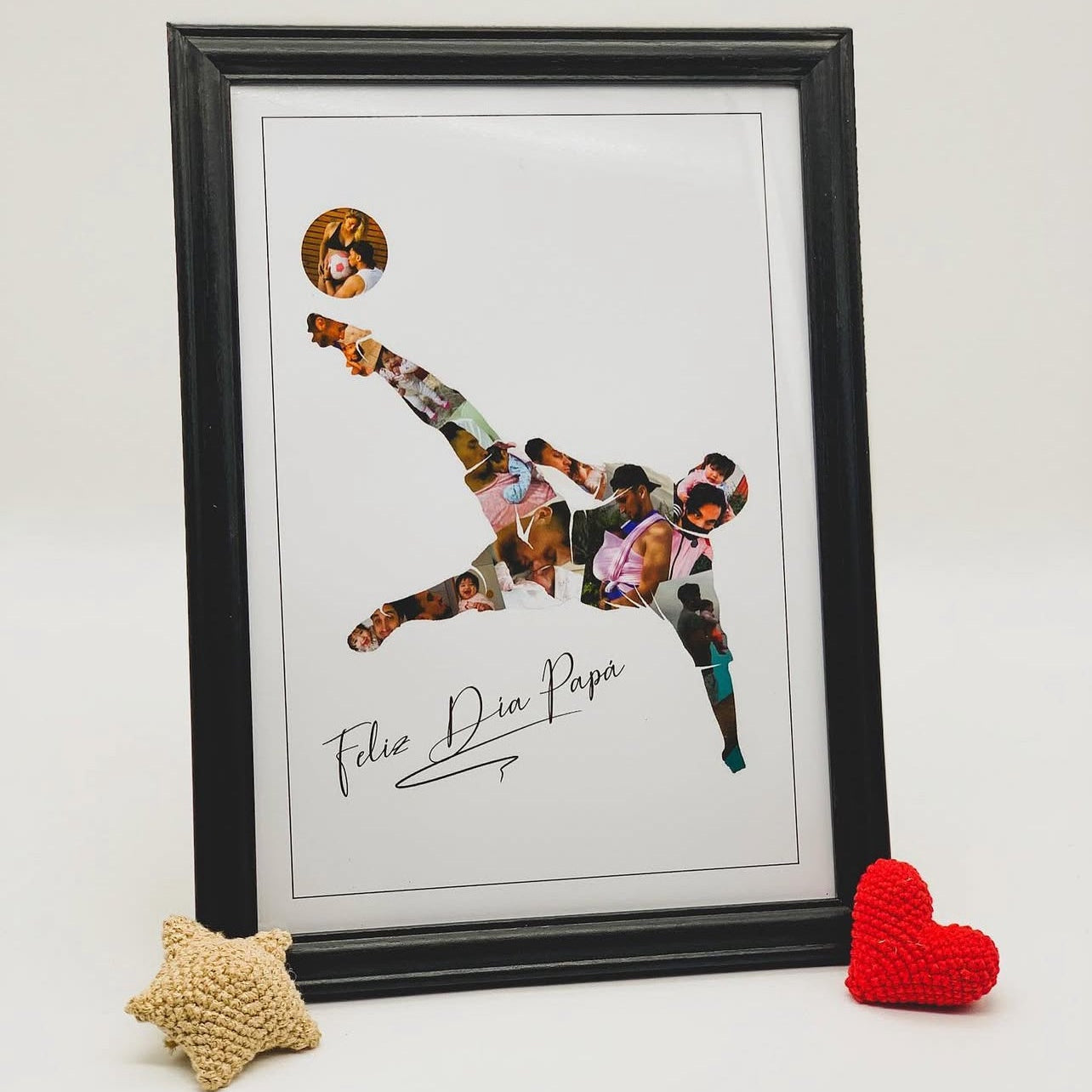 Para el futbolista de casa. Diseñado para quienes viven cada partido con pasión. Rellena la silueta con las fotos que quieras y agrega una frase personalizada. Un regalo perfecto para quienes aman el fútbol. Cada cuadro es personalizado, incluye impresión, marco y viene envuelto listo para regalar.